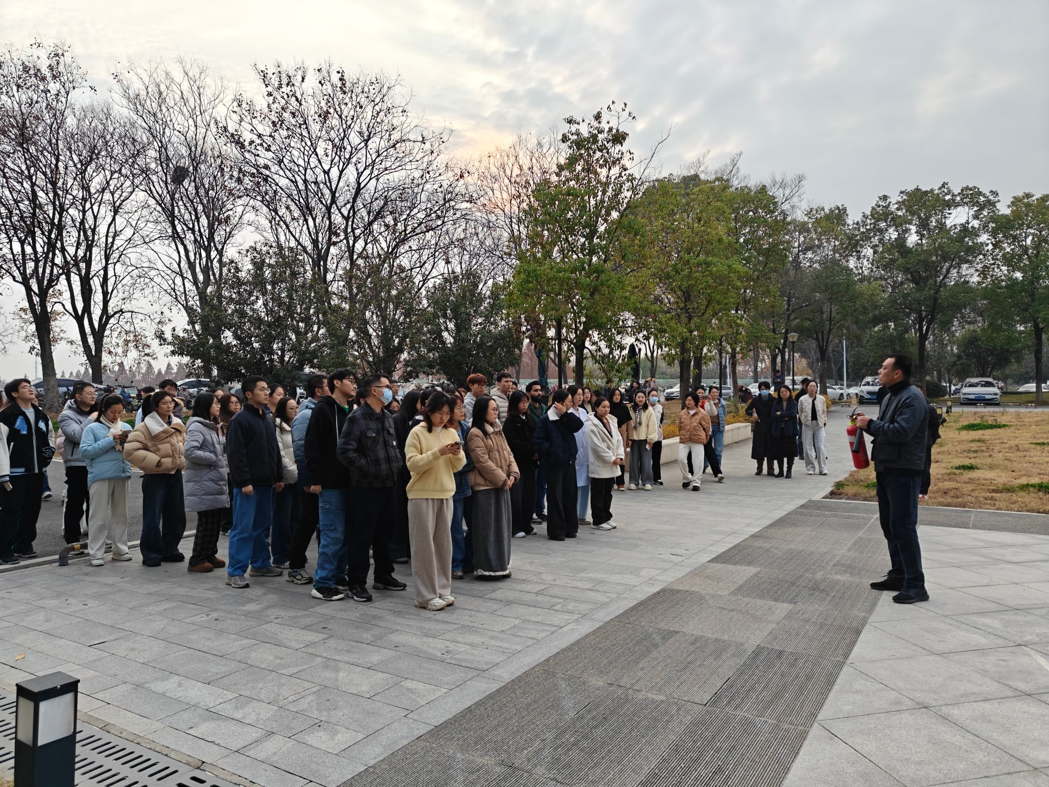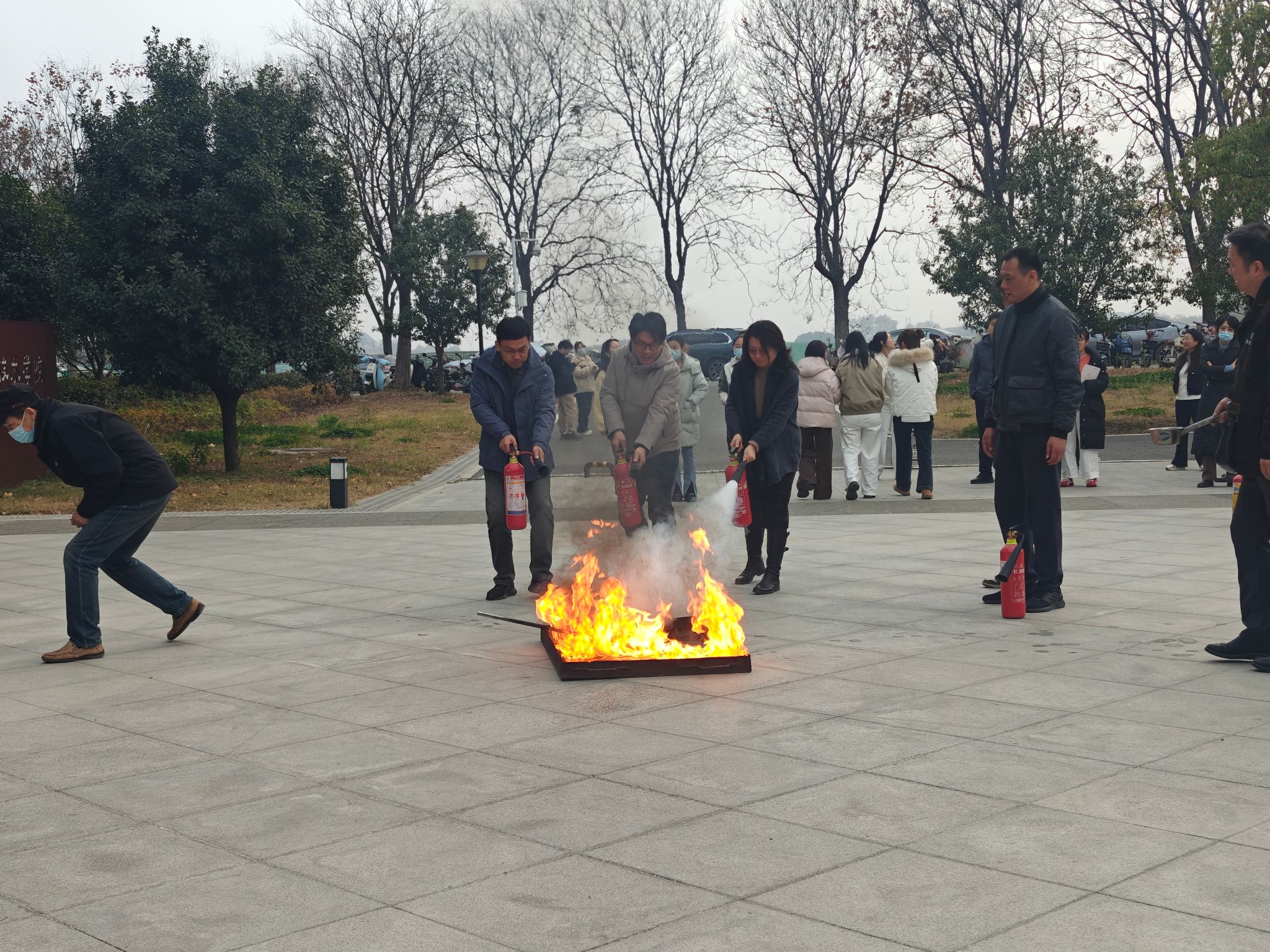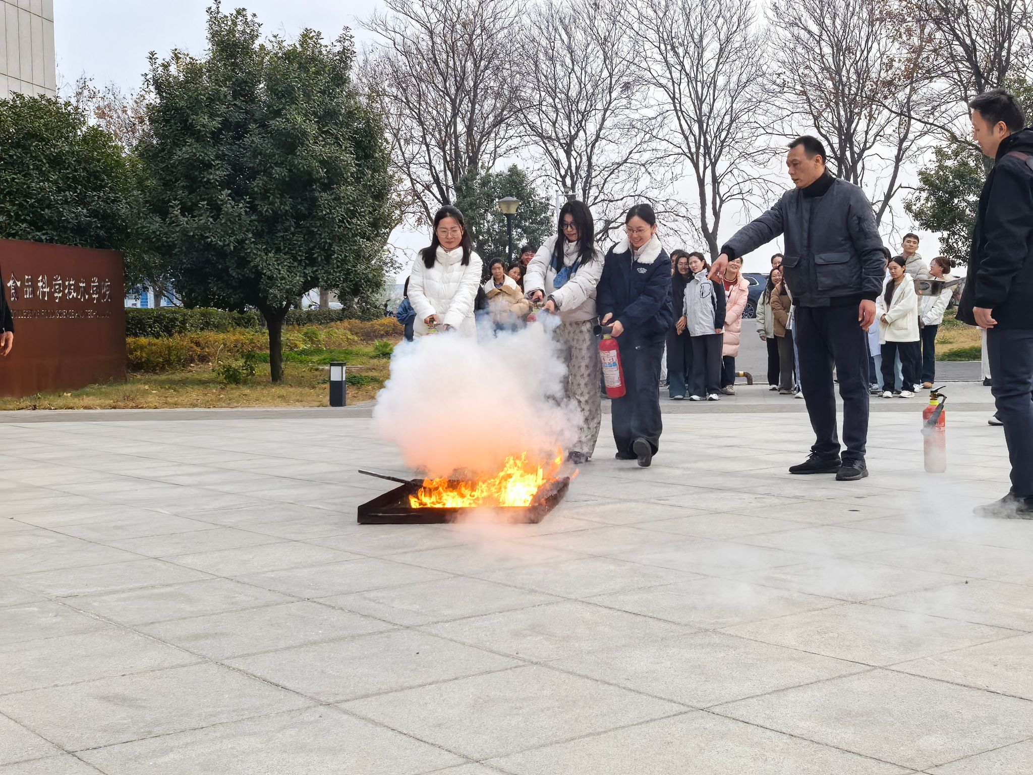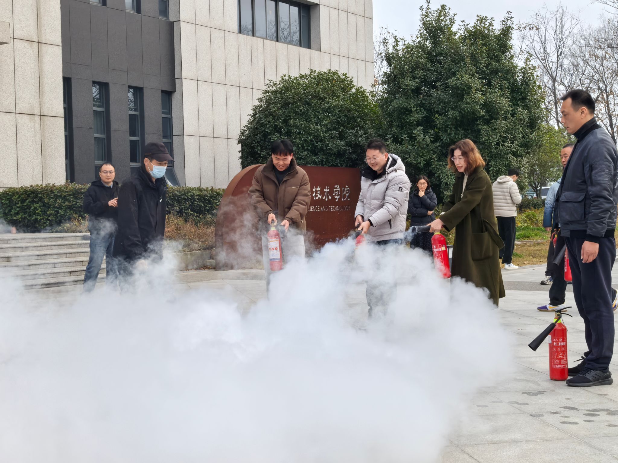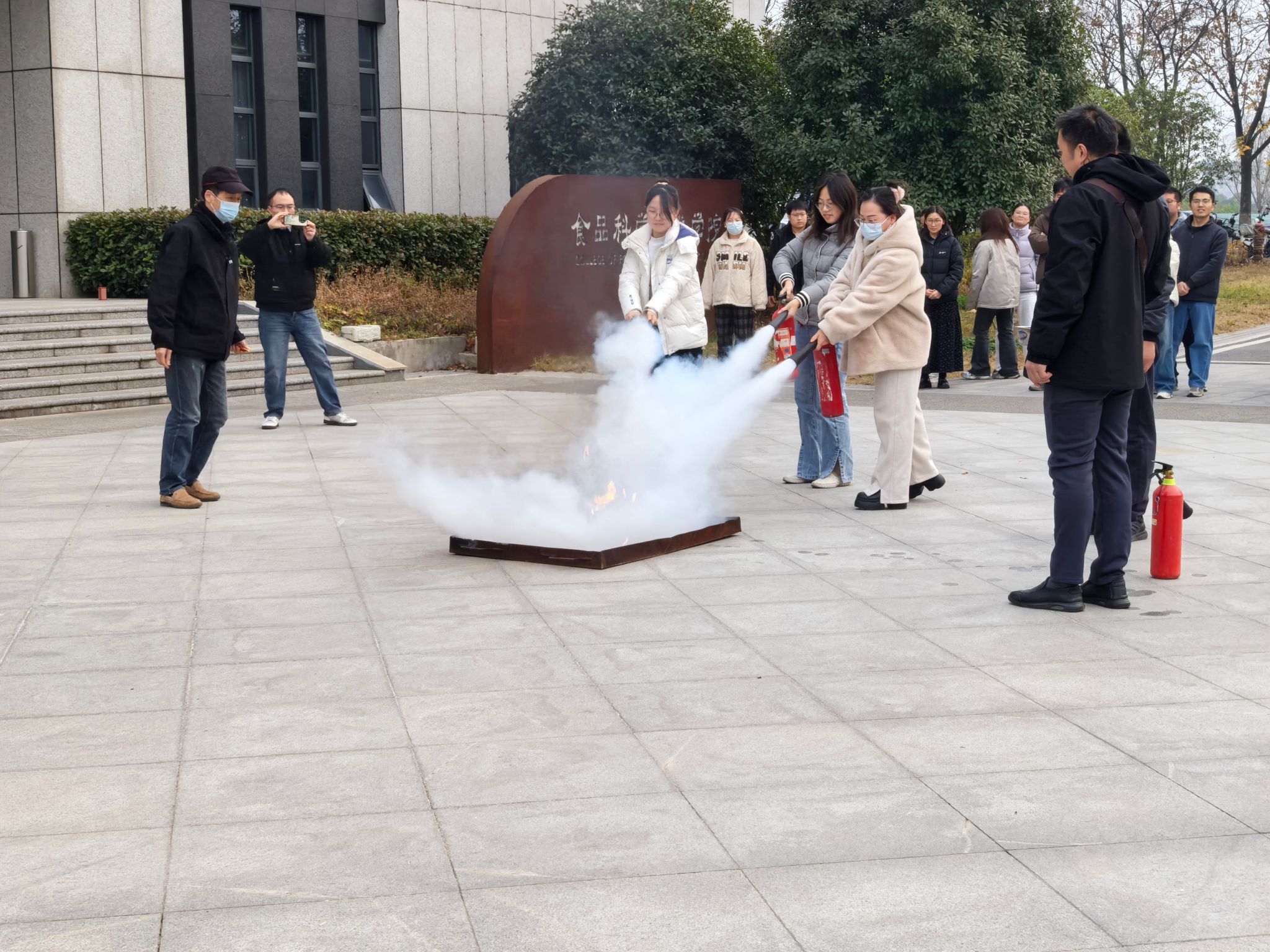 随后,实验室师生在建安部负责老师的指导下于院楼前进行实操演练。通过动手操作,学生们不仅掌握了灭火器的使用方法,更对火灾防范有了深刻的认识。