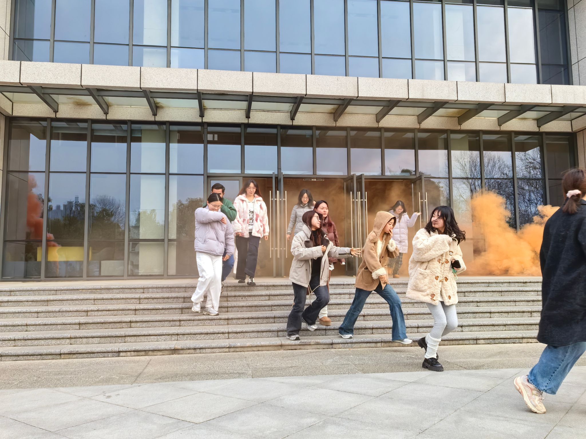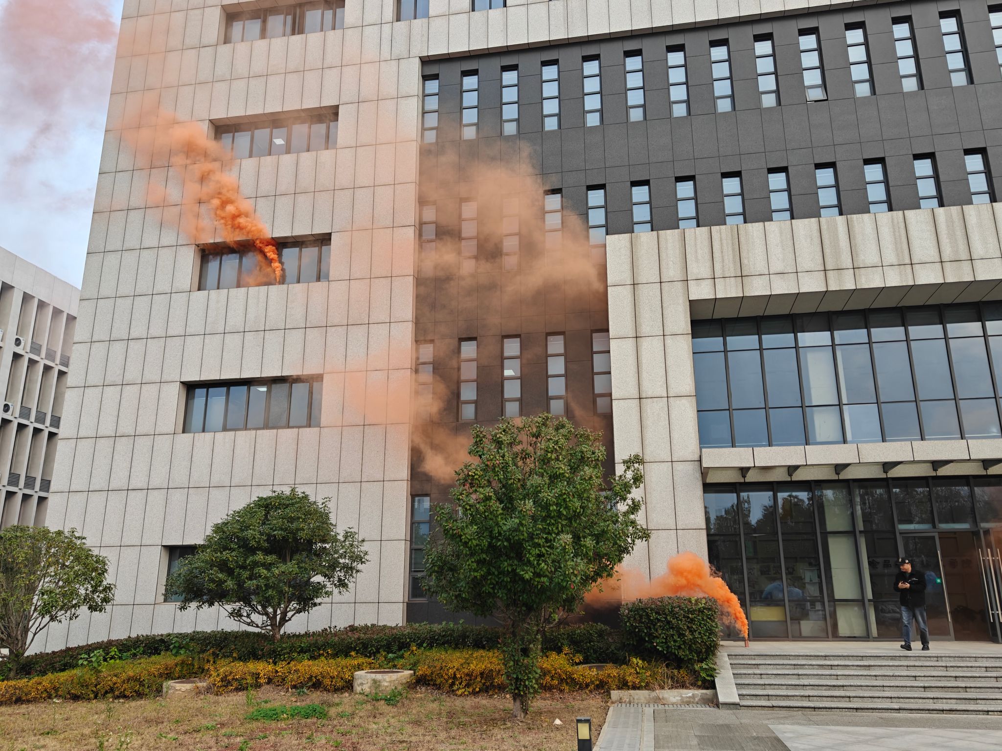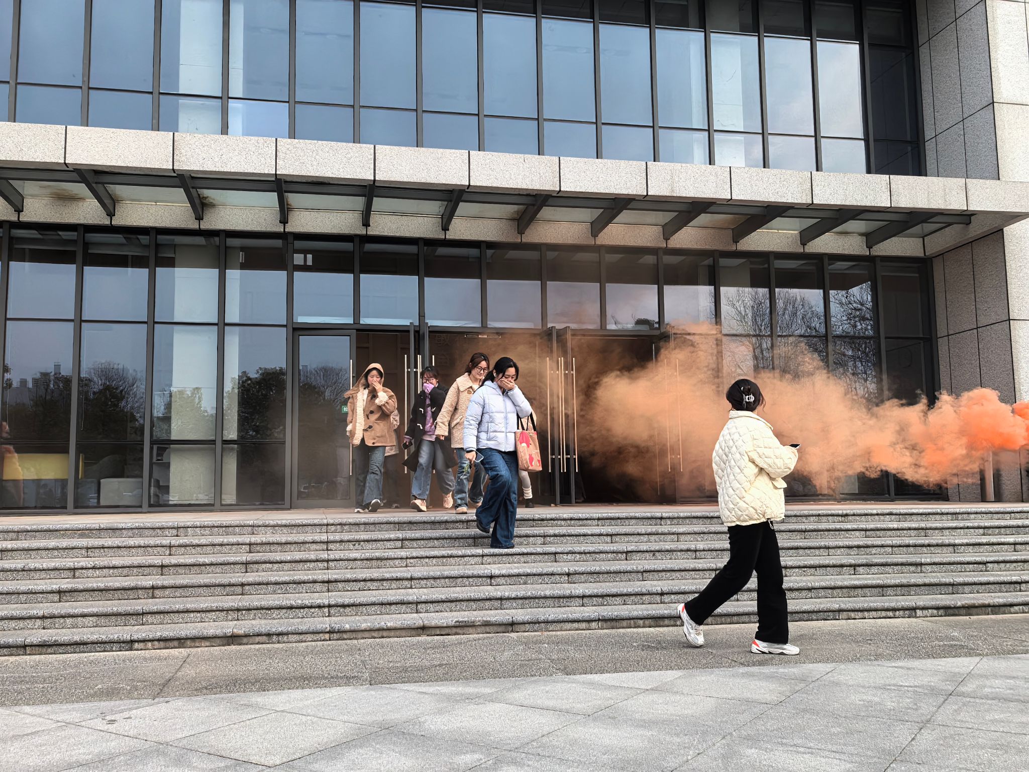 下午16时,建安部工作人员通过楼内消防报警器发布指令,演练正式启动。楼内师生听到消防警报铃声立即进行疏散撤离。师生按照:实验室/自习室/办公室→走廊→疏散楼梯→安全出口→集结点(学院大楼前空地)的路线撤离,全程禁止乘电梯。